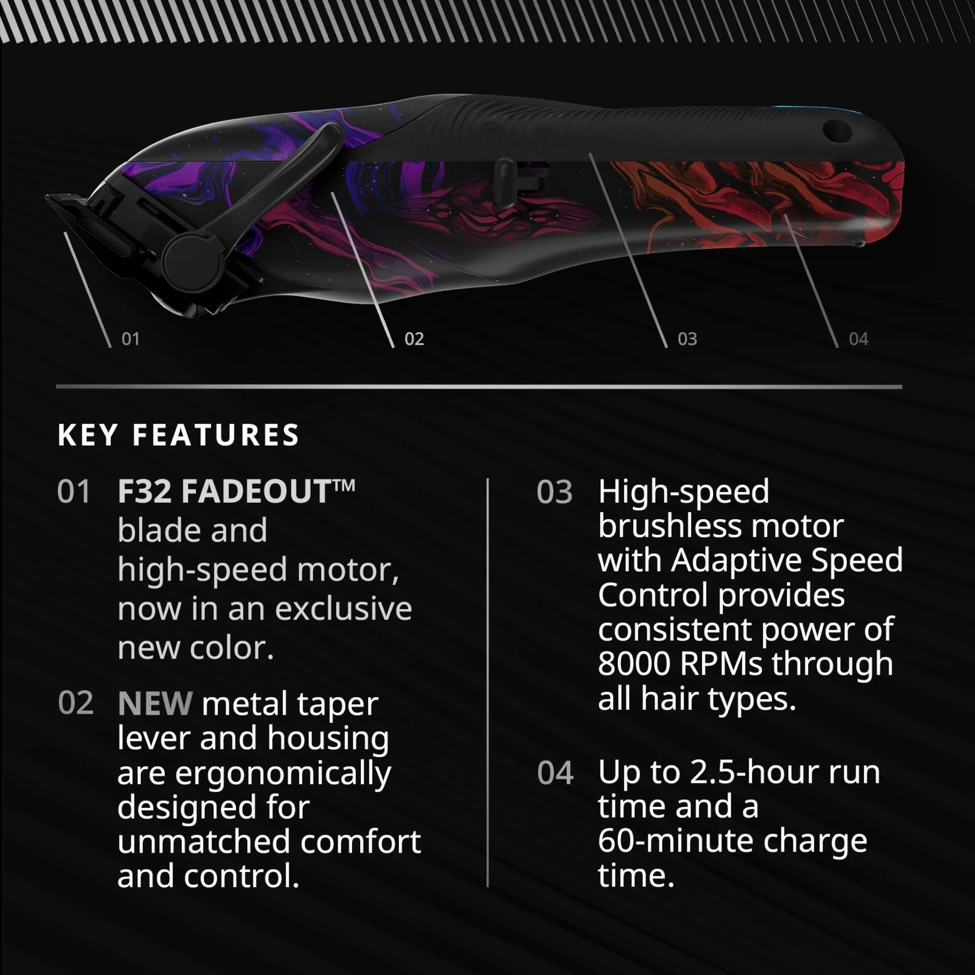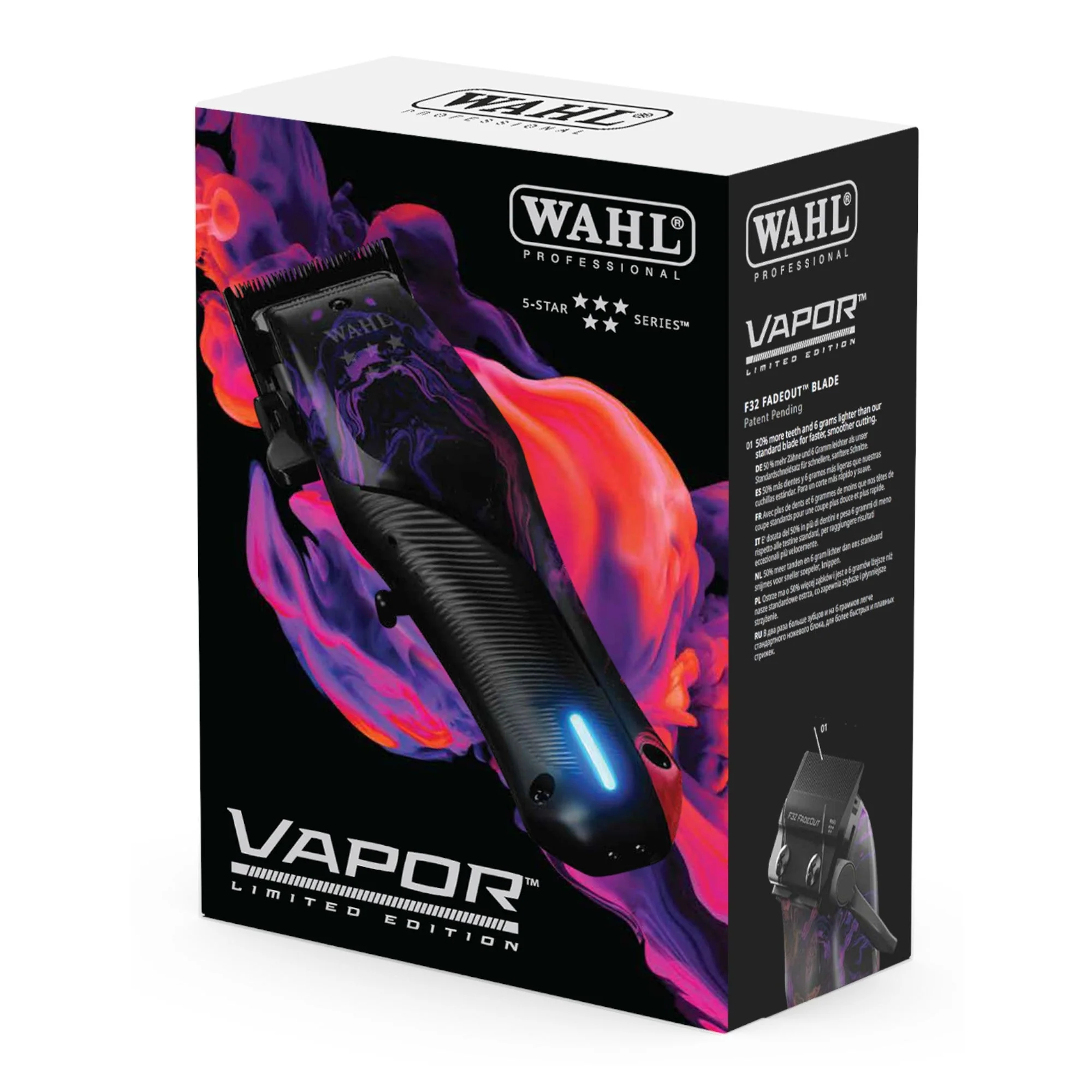 De Wahl Vapor is voorzien van een krachtige motor in combinatie met het nieuwe, gepatenteerde F32 FADEOUT-snijmes voor snelle en nauwkeurige resultaten.